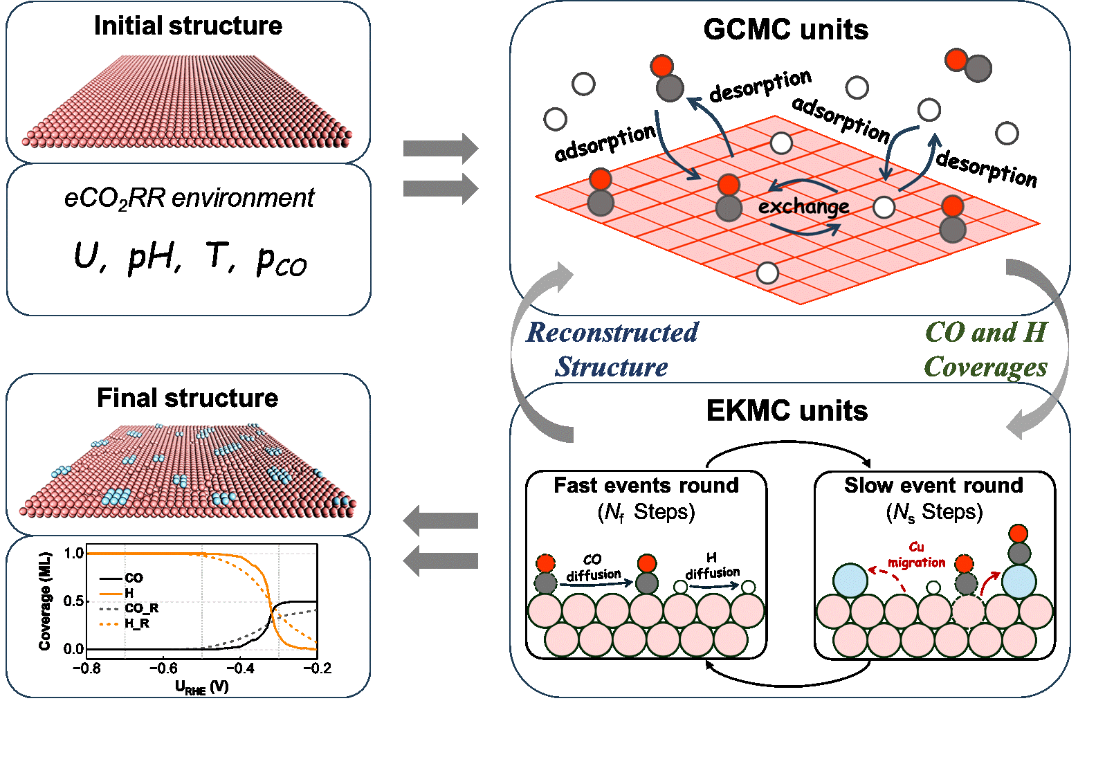 基于以上研究背景,高嶷研究员团队基于本组开展的反应环境动力学蒙特卡洛(EKMC)模拟方法,结合电势依赖的巨正则蒙特卡洛(GCMC)模拟和密度泛函理论(DFT)方法,针对eCO2RR的关键中间体诱导Cu(100)表面原子级重构机理和重构表面对反应性能的影响进行了系统研究。研究成果以“Reaction-Driven Varieties of Active Sites on Cu(100) in Electrochemical CO2 Reduction Reaction”为题发表在ACS Catalysis上。