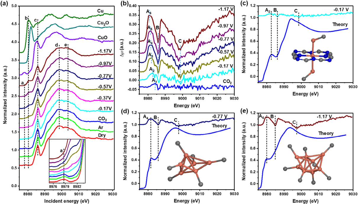 近期,上海光源研究团队基于BL14W1-XAFS线站,利用原位高能量分辨荧光检测X射线吸收谱学(HERFD-XANES)方法,并与差谱(Δμ )分析以及近边拟合相结合,精确地识别了Cu(II)Pc模型催化剂在CO2RR过程中活性位点由CuN4C8到Cu团簇的转变,为多碳产物的“C-C耦合”给予了结构起源。该论文以“Operando HERFD-XANES and surface sensitive Δμ analyses identify the structural evolution of copper(II) phthalocyanine for electroreduction of CO2”为题发表在期刊Journal of Energy Chemistry上,第一作者为中科院上海应用物理研究所博士研究生梅丙宝,通讯作者是上海高等研究院姜政研究员。