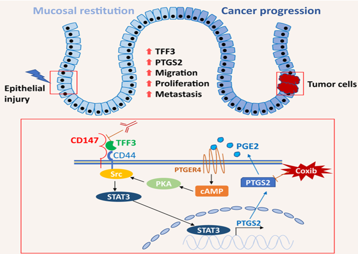 该研究表明跨膜蛋白CD147是TFF3的新型受体。当TFF3与CD147结合时,它会促进CD147和CD44s之间的相互作用,导致原癌基因酪氨酸蛋白激酶SRC和STAT3信号通路激活以及PTGS2的表达升高。这些事件对于TFF3诱导的细胞迁移、侵袭和增殖至关重要。使用竞争性抗体阻断TFF3-CD147相互作用或PTGS2抑制剂可减少CRC肺转移。这些发现为胃肠道疾病的治疗开展铺平了道路。