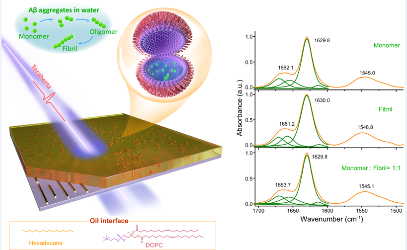 图 神经退化性疾病蛋白积聚物的纳米液滴-太赫兹超材料高灵敏探测(左)与同步辐射显微红外光谱表征(右)