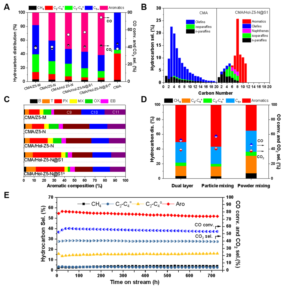 本文构建了鳞片状Silicalite-1(S1)包裹的纳米中空ZSM-5分子筛并与CoMnAl氧化物耦合,双功能催化剂在温和反应条件下,同时展现了高CO转化率、高芳烃选择性与高稳定性,并取得了前所未有的PX时空产率。顺利获得在纳米中空ZSM-5表面外延生长与之具有相同拓扑结构的鳞片状Silicalite-1分子筛,在不影响传质的条件下有效地钝化了外表面酸性,促进了PX的选择性生成。在280 oC、2 MPa和1000 mL g-1 h-1的温和反应条件下,CO转化率70.7%,烃类产物中芳烃选择性大于63.5%,CH4选择性为2.9%,芳烃中PX的比例高达34.7%,综合性能著优于此前报道的催化体系。而且,该催化剂的活性和选择性能够维持700小时以上而未见衰减,展现出了优异的工业应用潜力。