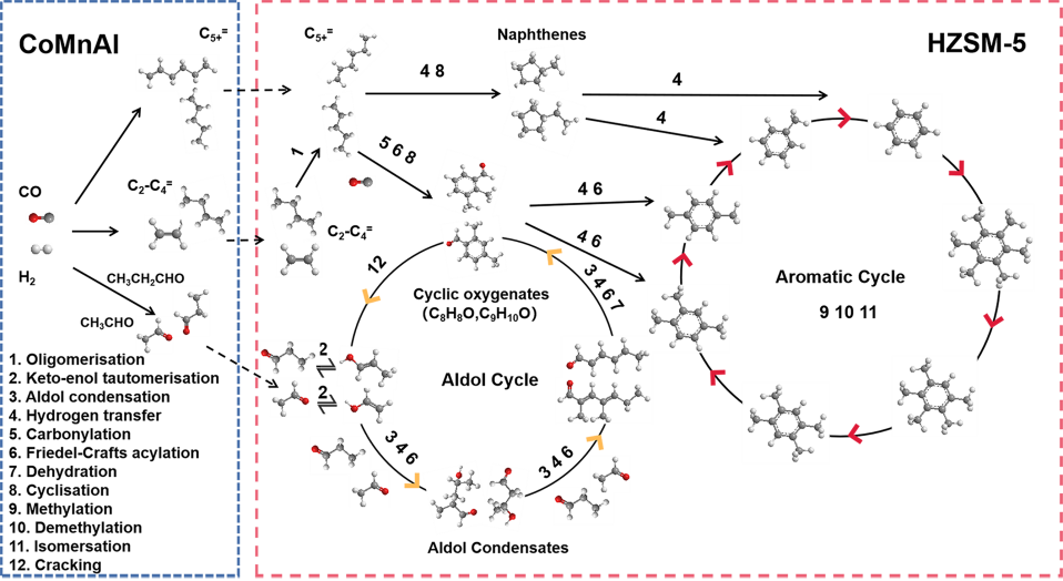 图2 CoMnAl/ZSM-5双功能催化剂上合成气制芳烃的反应路径网络