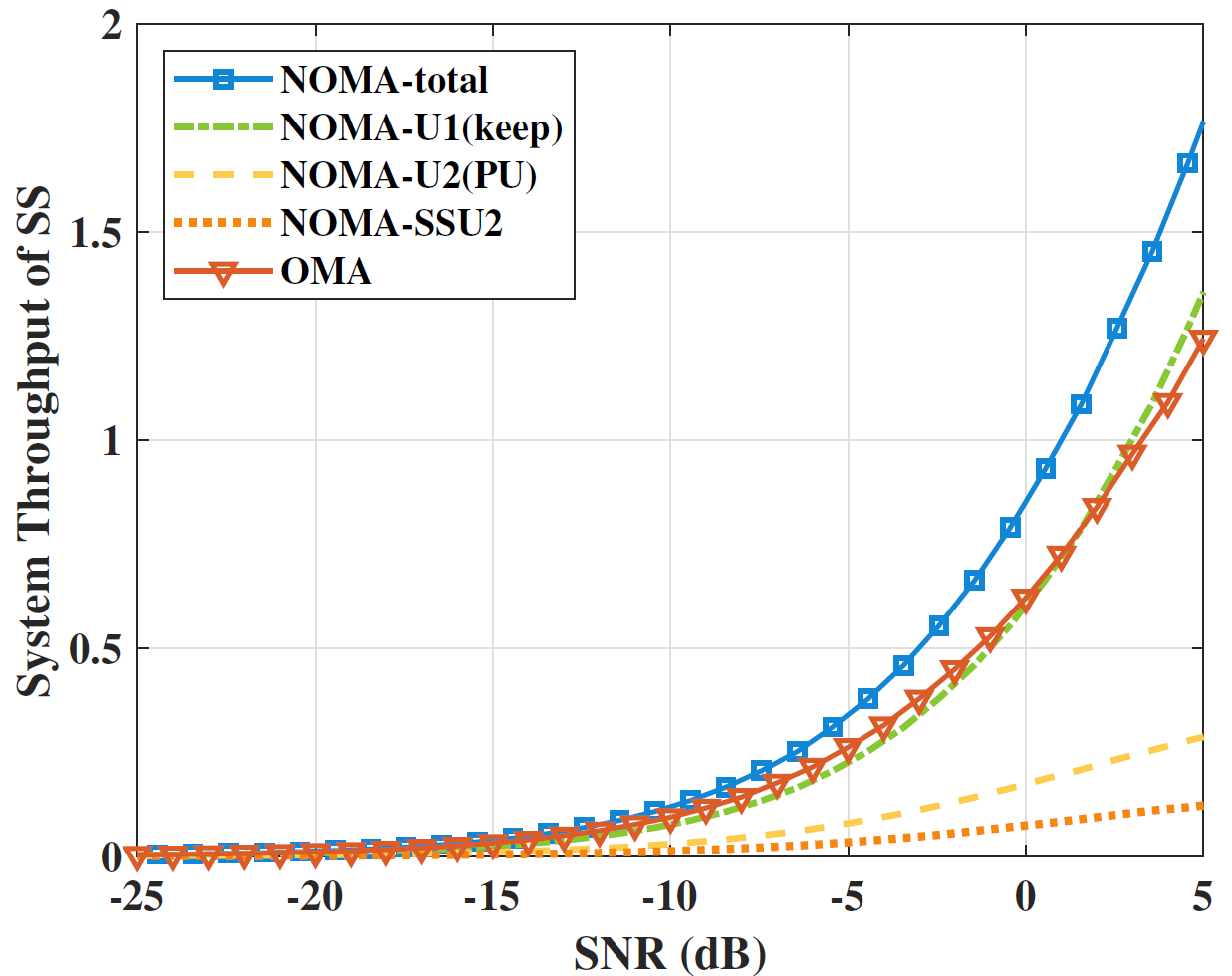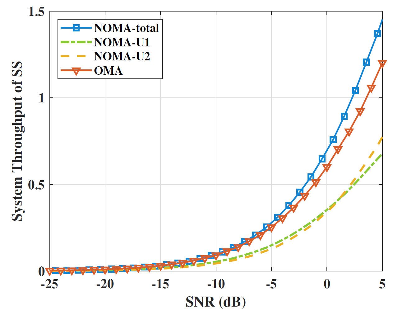 图4 上行混叠物联系统中不同技术的吞吐量性能对比(所提技术为蓝线)